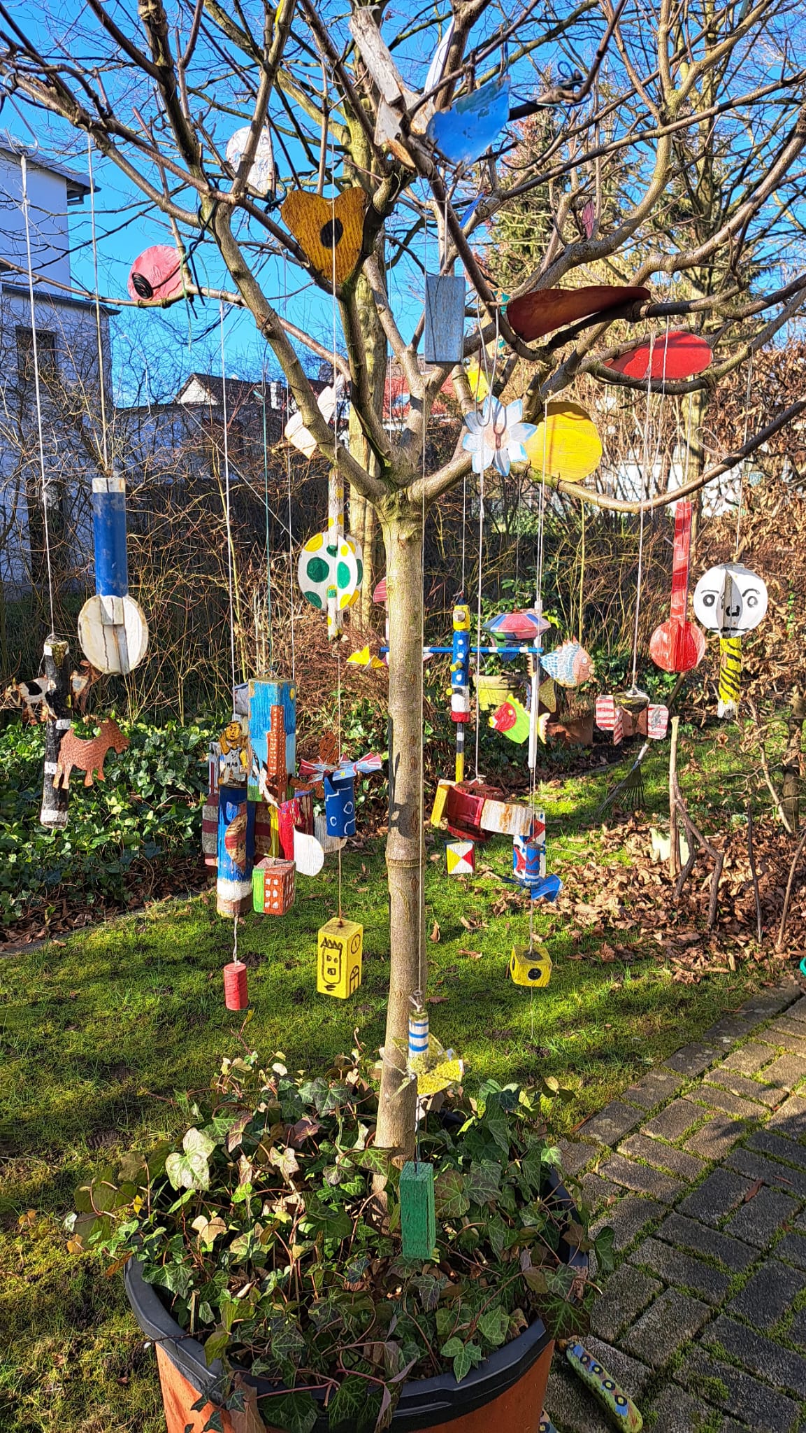 Holz, Dosenblech mit Acryl bemalt, Höhe des Baums mit Pflanzenkübel 3 Meter