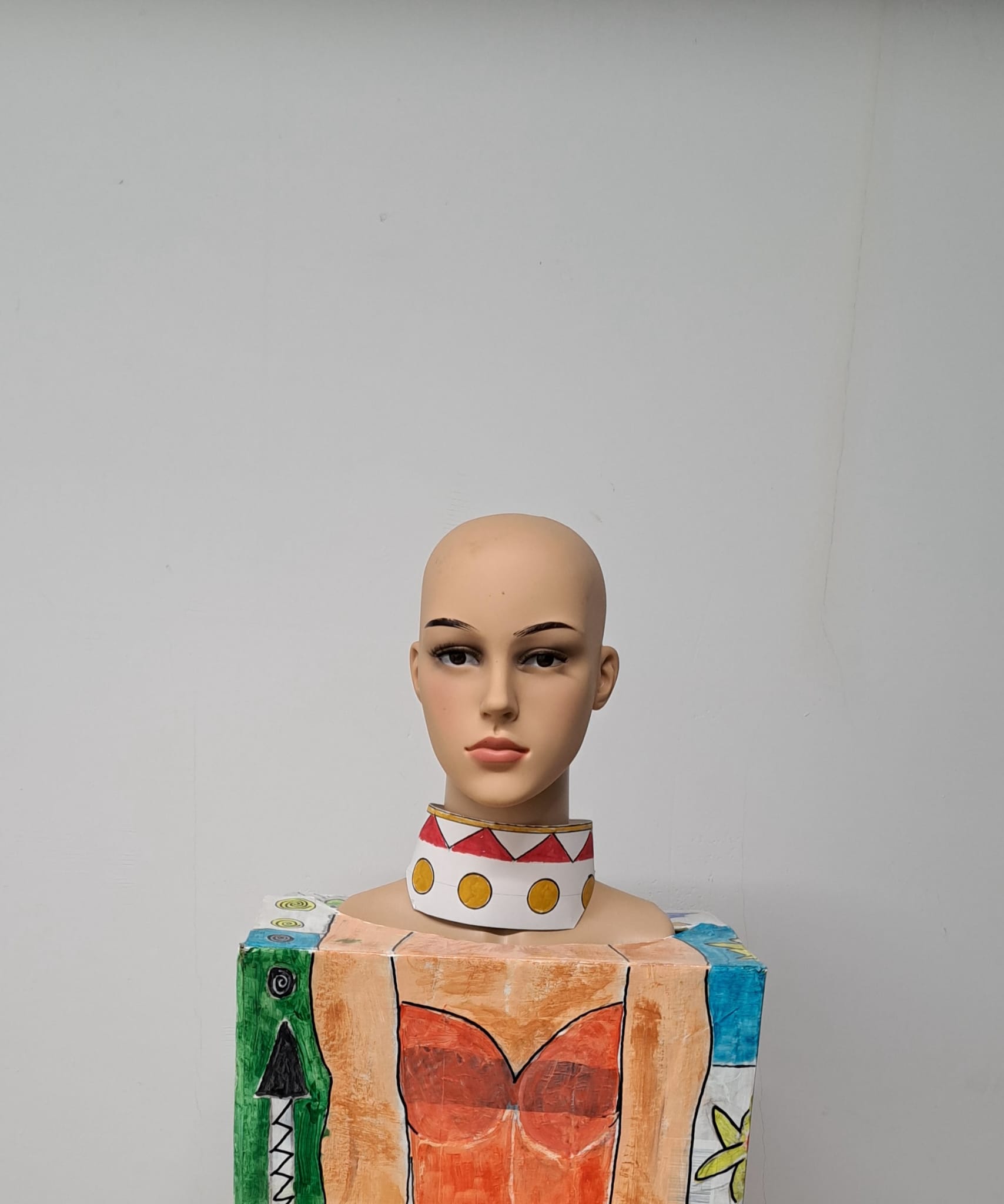 Puppenkopf, Pappe, Acryl, 53 x 38 cm
